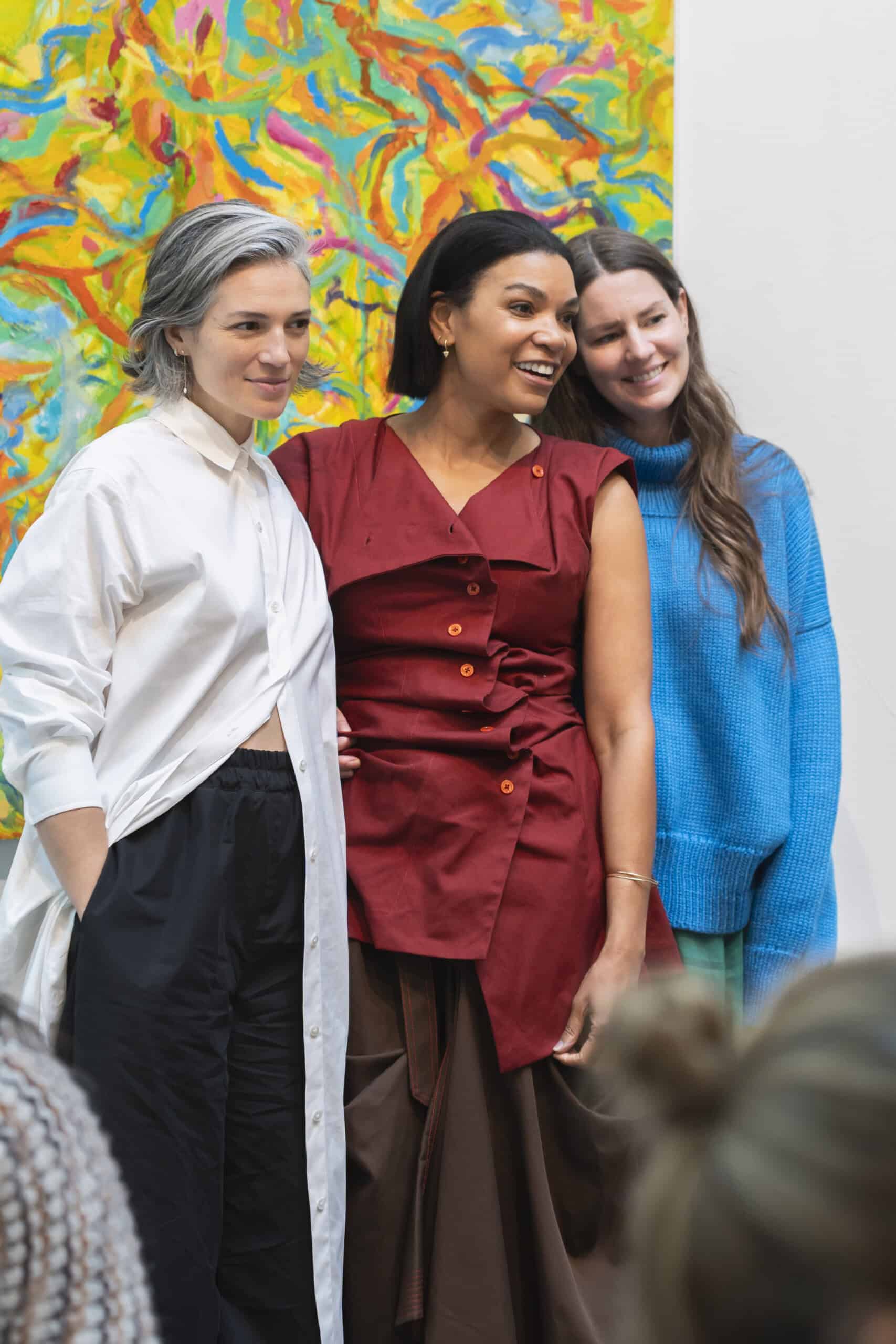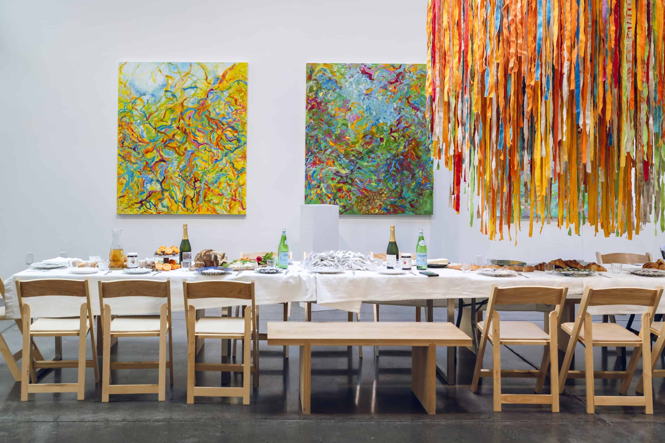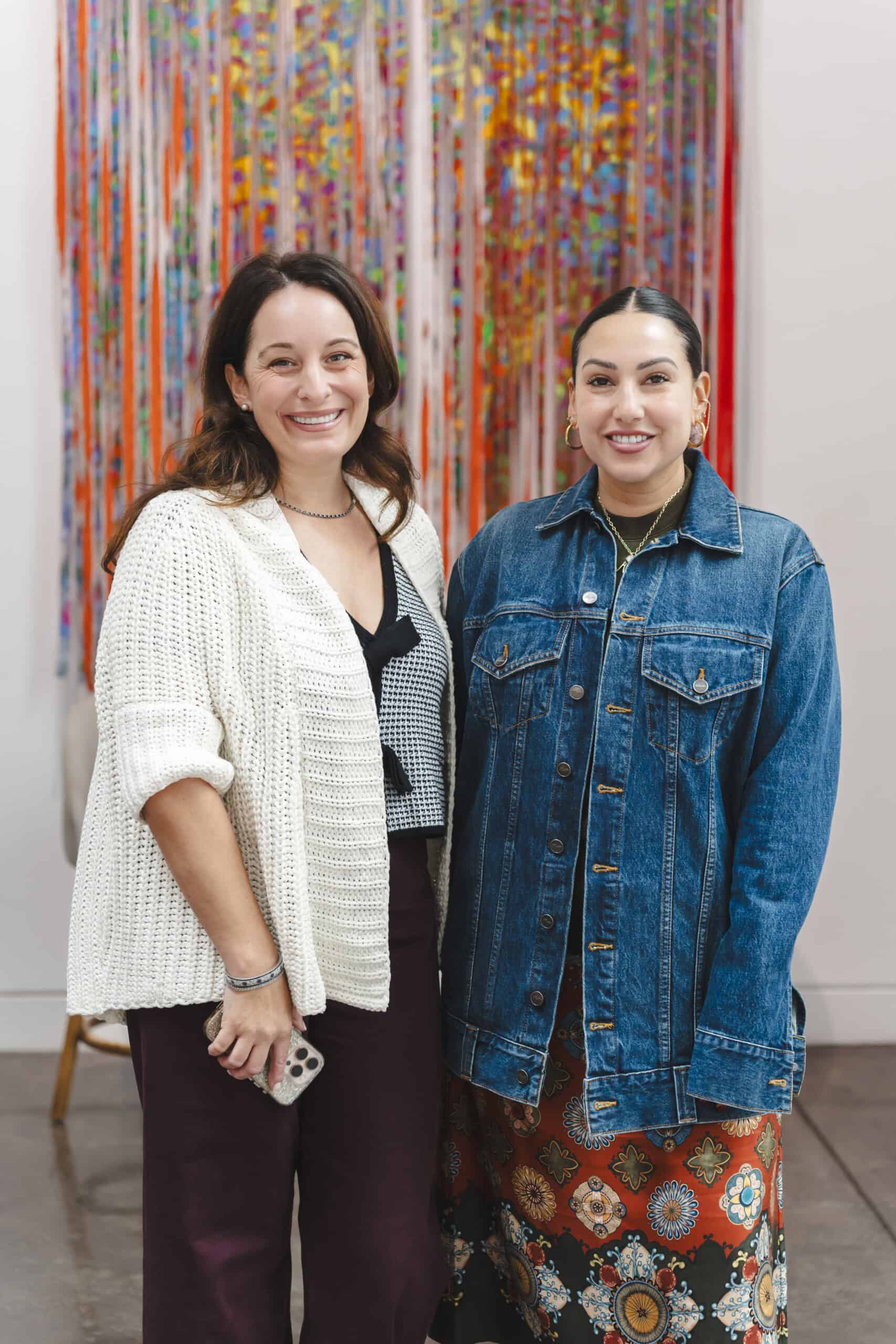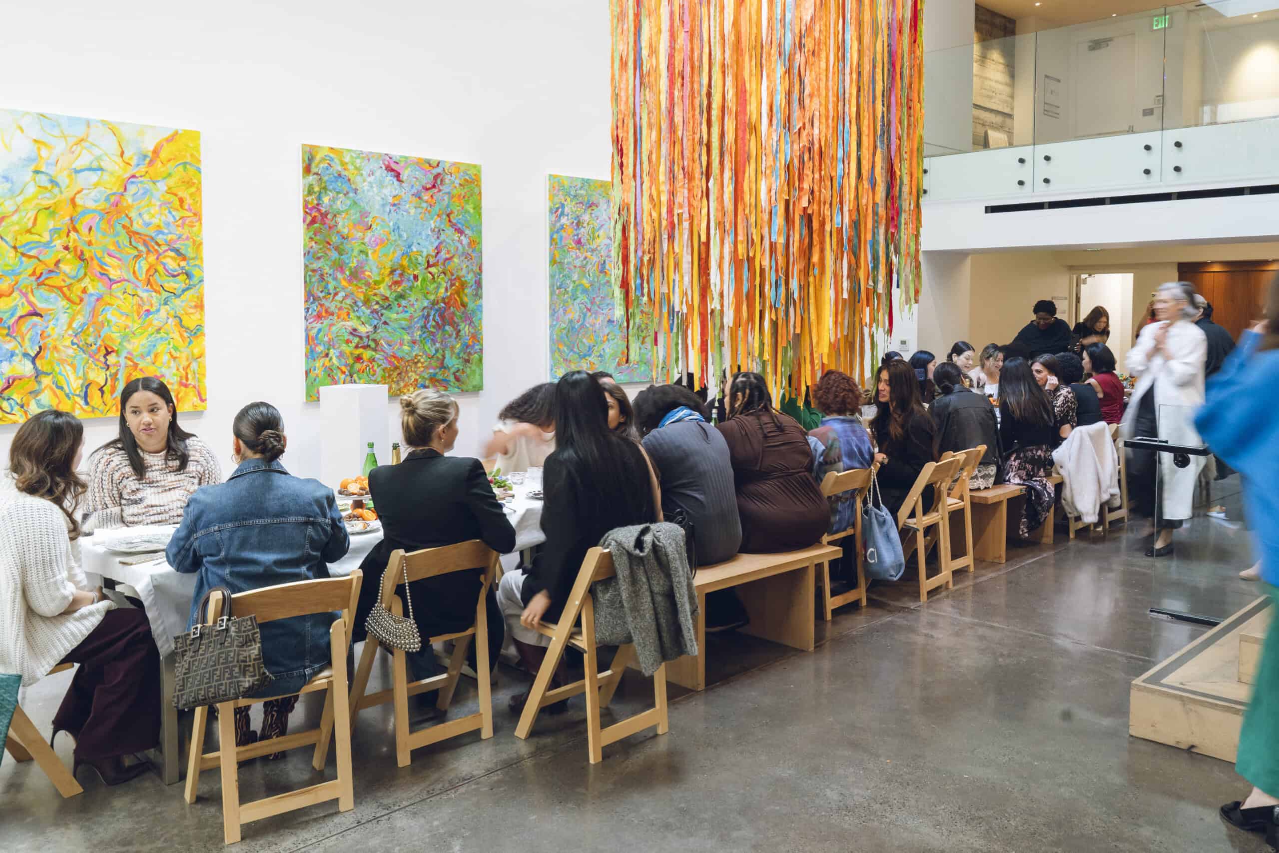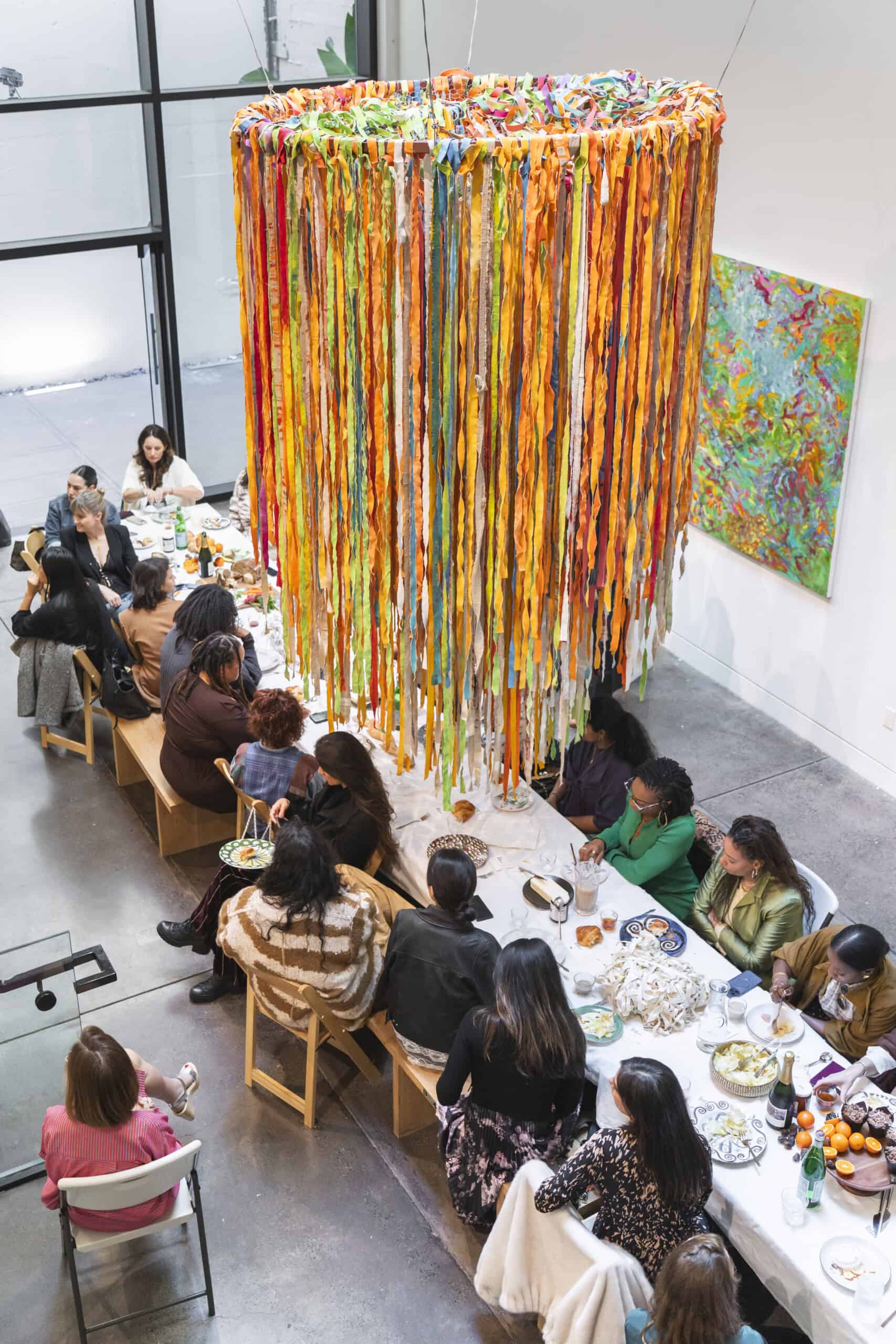 Last month, we gathered in the heart of San Francisco for an unforgettable afternoon at the mom-owned Chandran Gallery, where we hosted a special lunch and conversation with visiting artist Shara Mays. In town from her new home in Cartagena, Mays welcomed our community into the immersive world of her exhibition, TORN UP, as guests dined on a beautiful spread of teas by Leaves and Flowers, colorful jams and wine (featuring Shara’s artwork), and pastries from Tartine. Seated beneath her suspended textile sculpture and surrounded by richly layered paintings depicting roots, the experience felt intimate and deeply meaningful—art, memory, and conversation woven together in one shared space.