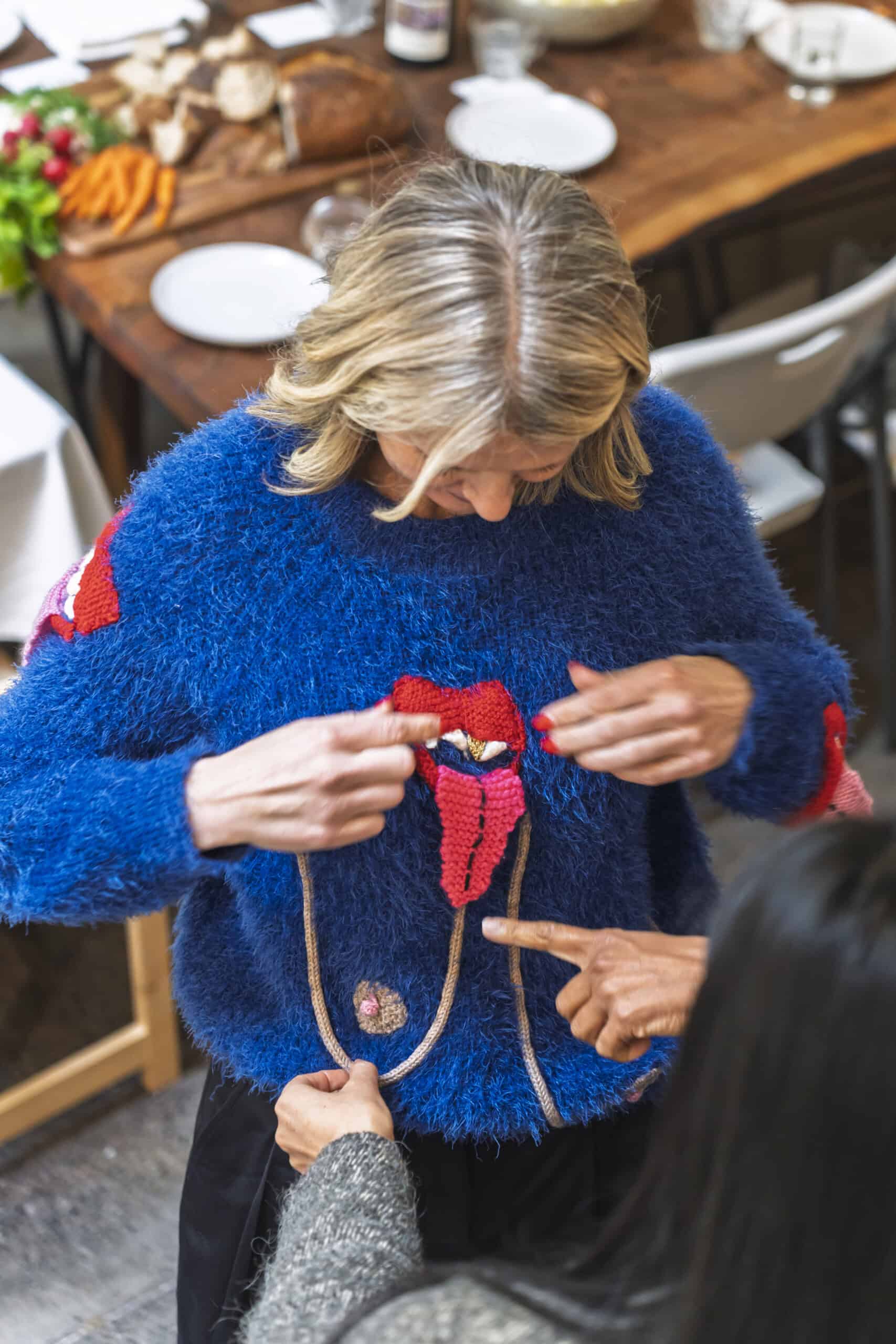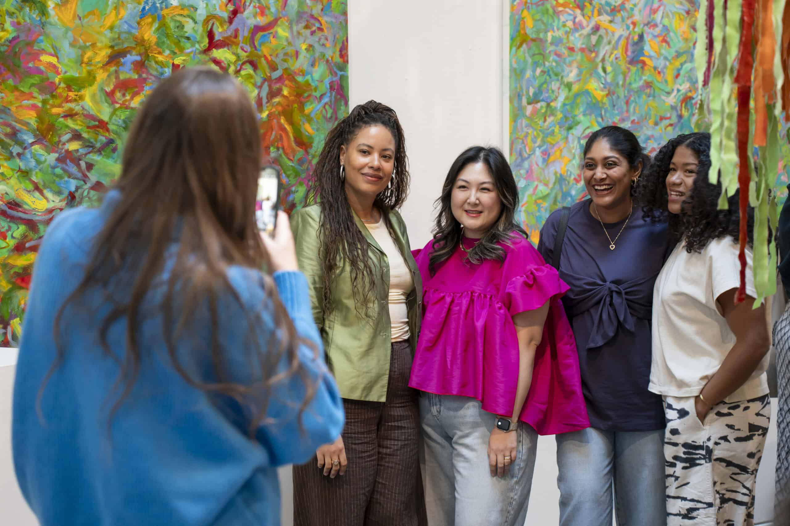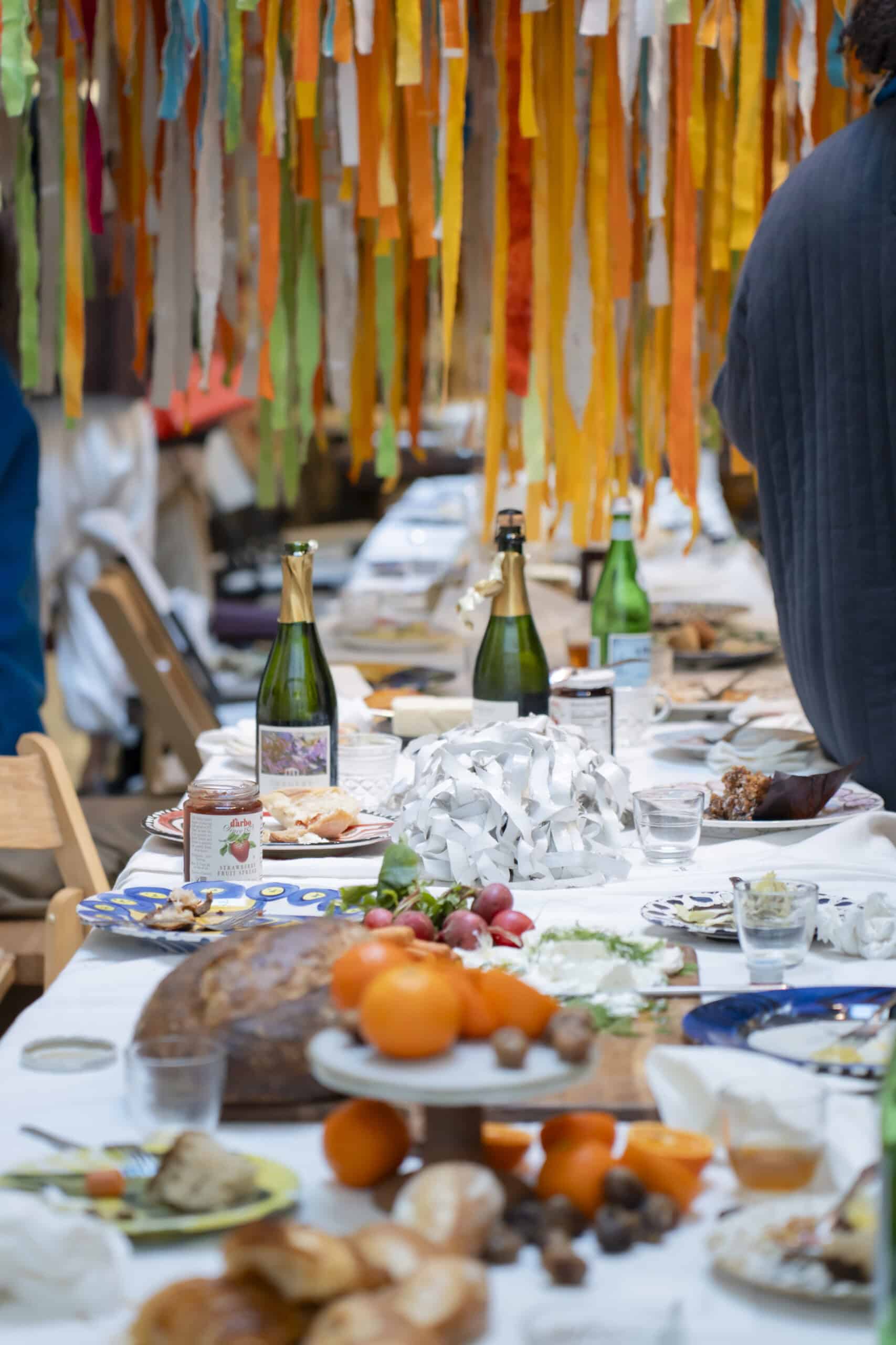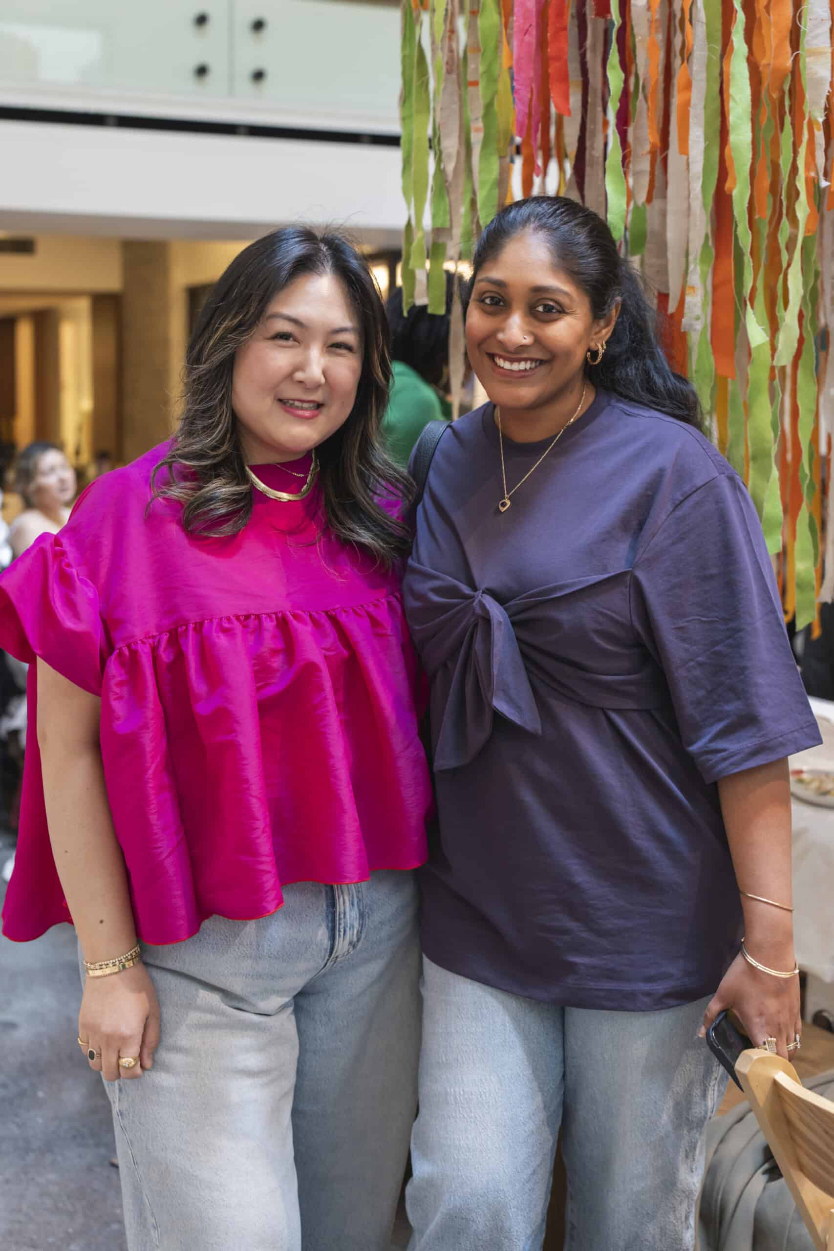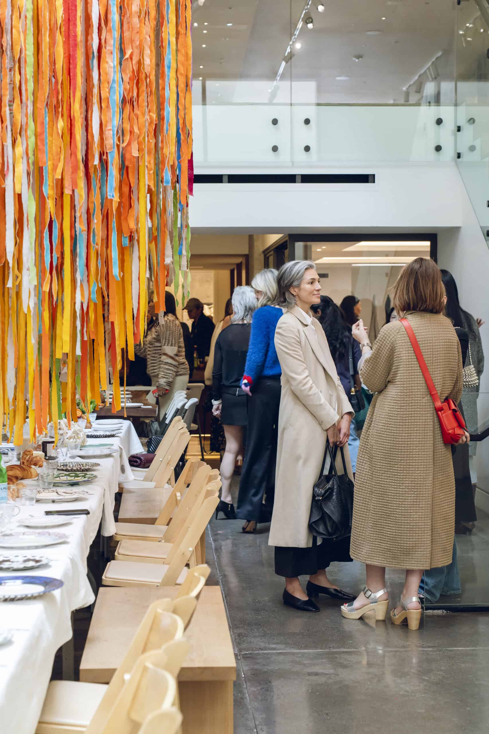 Last month, we gathered in the heart of San Francisco for an unforgettable afternoon at the mom-owned Chandran Gallery, where we hosted a special lunch and conversation with visiting artist Shara Mays. In town from her new home in Cartagena, Mays welcomed our community into the immersive world of her exhibition, TORN UP, as guests dined on a beautiful spread of teas by Leaves and Flowers, colorful jams and wine (featuring Shara’s artwork), and pastries from Tartine. Seated beneath her suspended textile sculpture and surrounded by richly layered paintings depicting roots, the experience felt intimate and deeply meaningful—art, memory, and conversation woven together in one shared space.